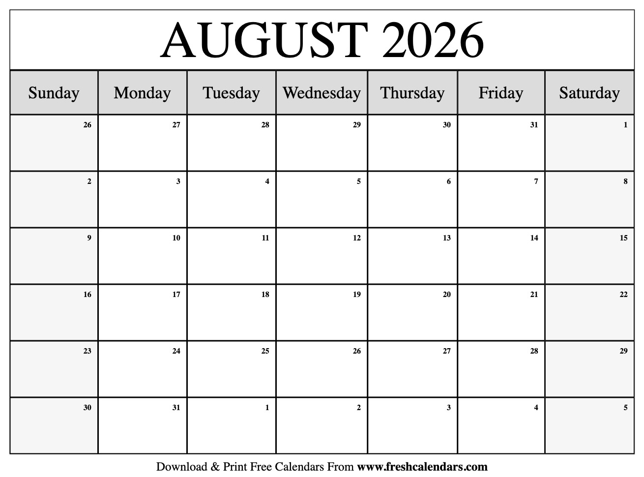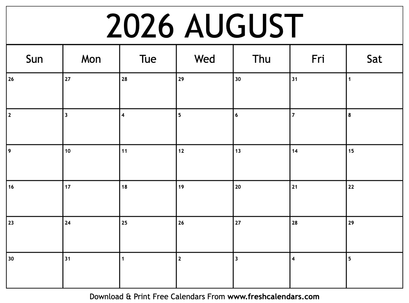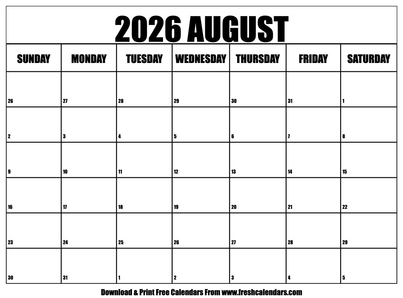 This calendar template free to use, you can find Blank Printable August 2026 Calendars or download directly from your browser. You can customize this calendar with the number of months you need and set print margins for your printer, and then print it with your own printer. We hope you enjoy this calendar templates for free and help you for activity schedule your activities and appointments.