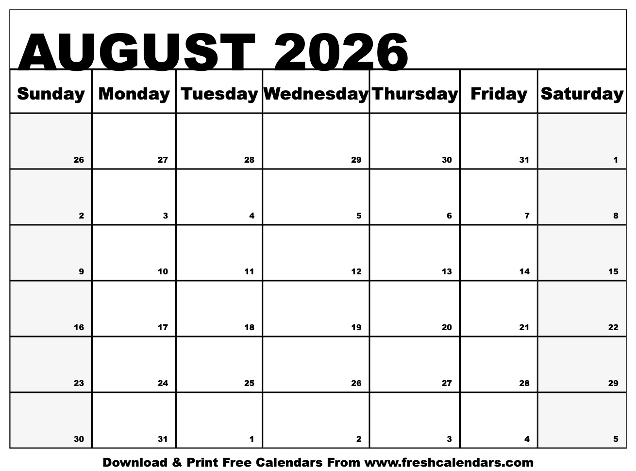 You will find a lot of printable August 2026 calendars on the website easily. After choosing your blank August 2026 calendar on the page, you should use them for different purposes easily. Check out all of the available calendars online and you will decide the best one for your special requirements. You have a chance to download all calendars as PDF or JPG format. You can also use them for different purposes like family, education or business works or plans. Also, you will have the less technical knowledge to edit your calendar template. You will need only an image editor to edit it on your PC or smart phone. After completing your calendar, your printable August 2026 calendar will be ready with your plants.
