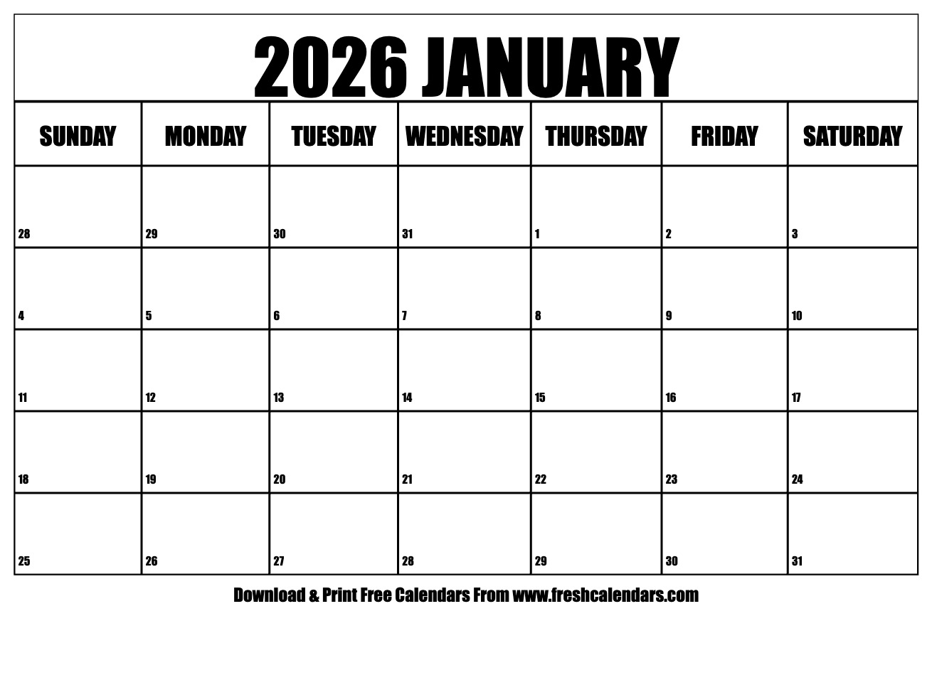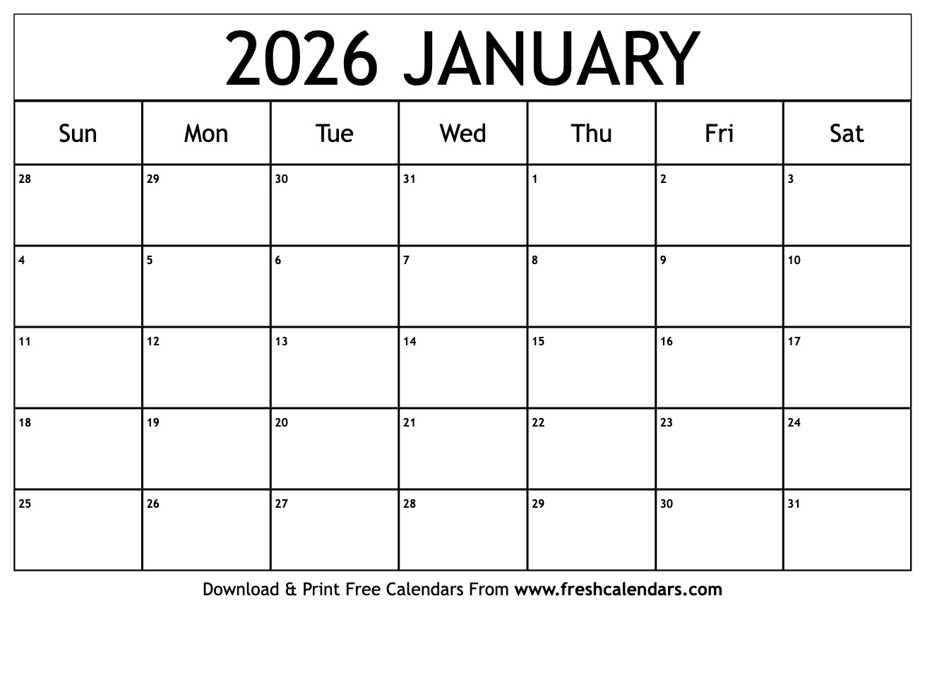 The January 2026 Blank Calendar is an important calendar which is used to plan day-to-day activities. It gives a summary of what your colleagues or friends have planned to do during the month. The blank calendars serve as reminders for you and your fellows. In fact, if you want to make your own January 2026 calendars, you should download our blank printable January 2026 calendars at no cost.