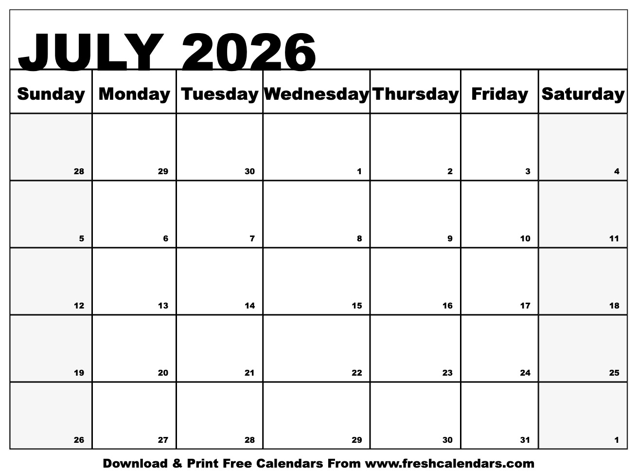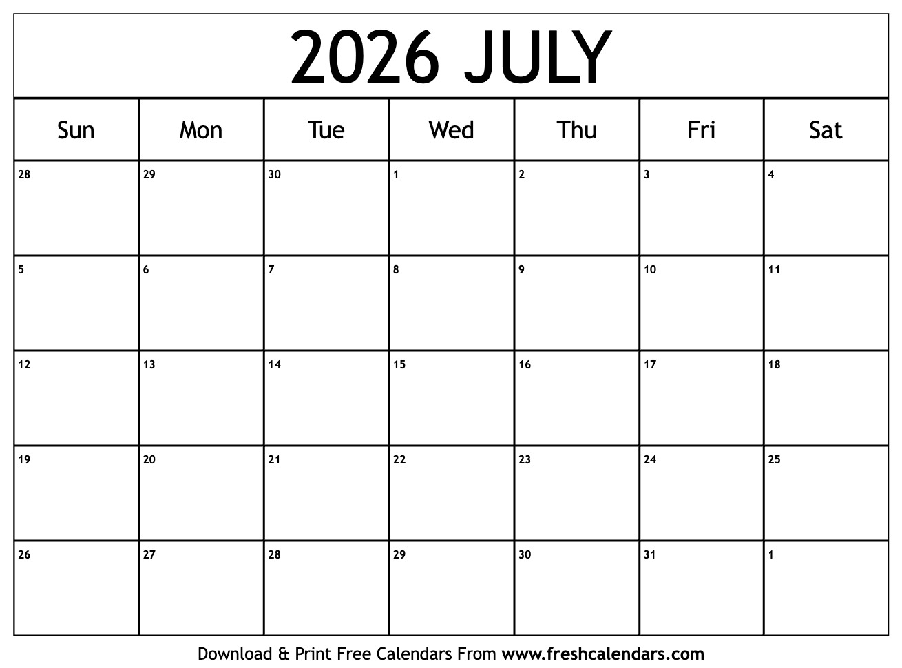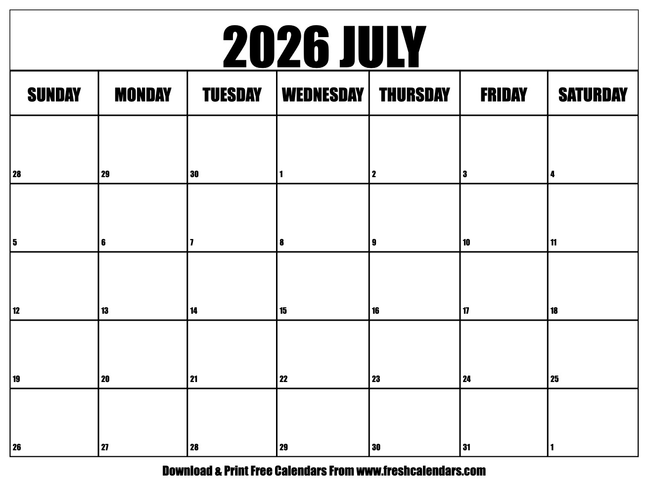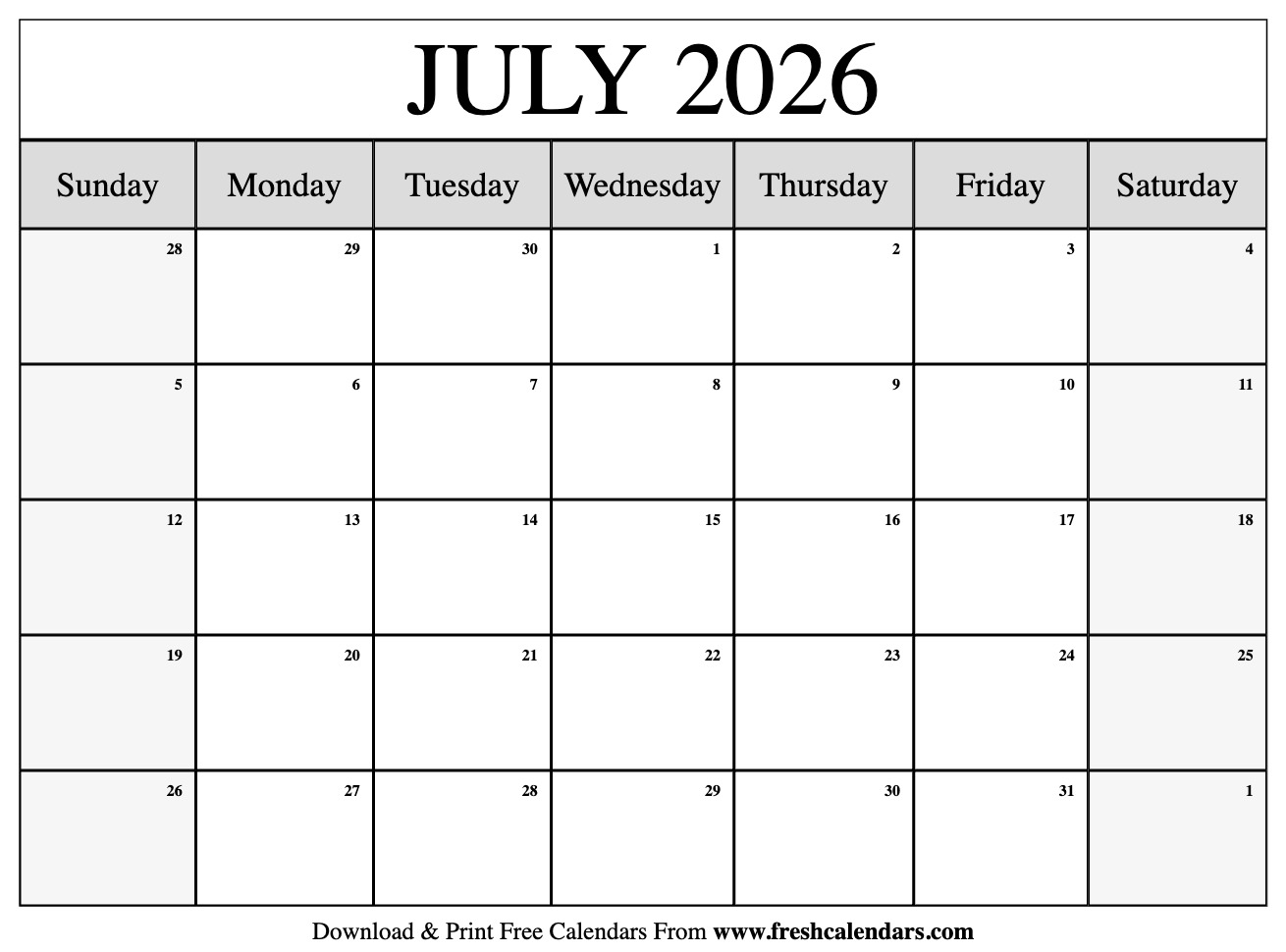 This July 2026 calendar PDF will be available to download on this page. You can use the blank or printable PDF file to create your own calendar for the year 2026 or share it with friends and family, who might want to keep a record of the future events.